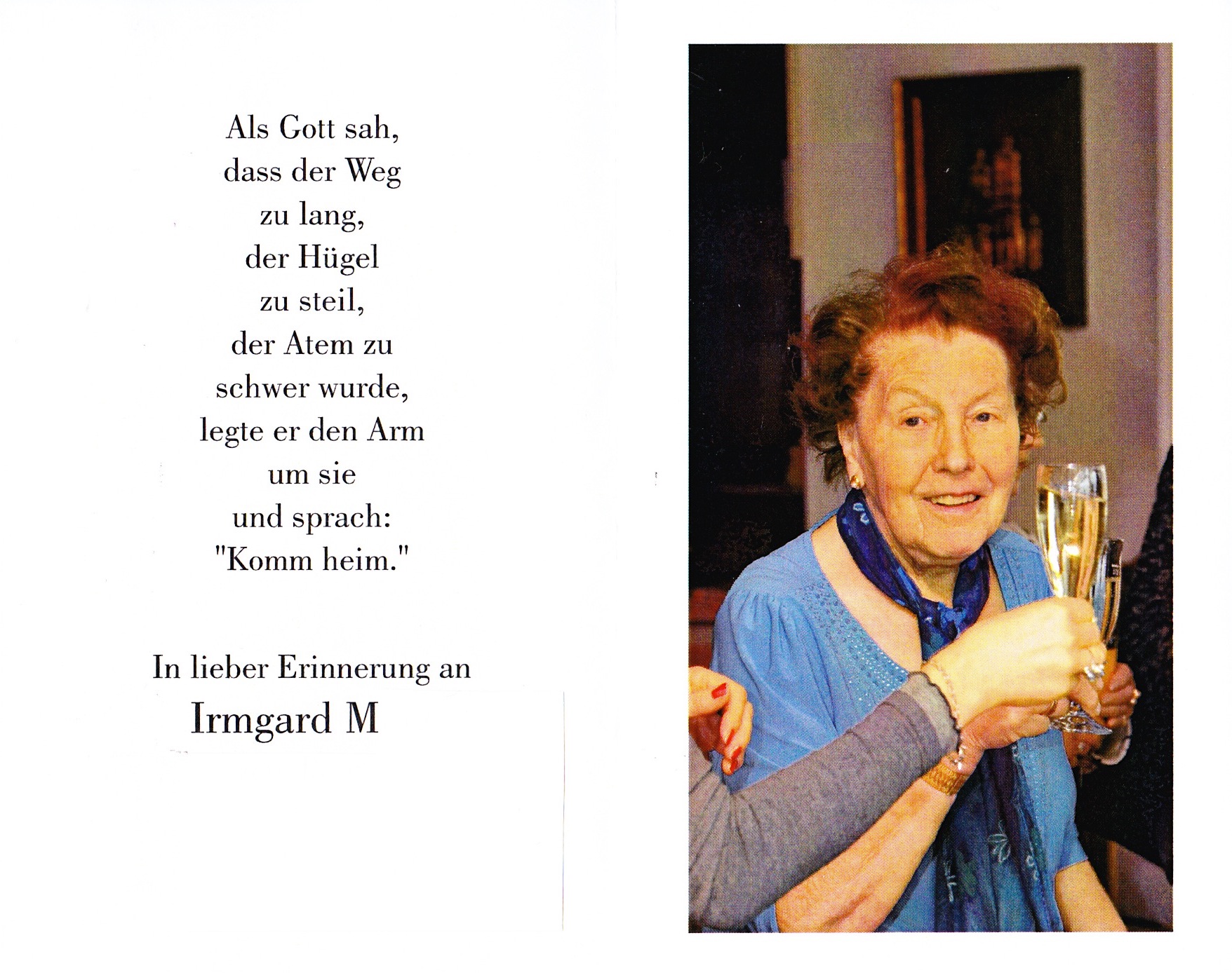 Irmgard M. (Namen und Anschrift ist der Redaktion bekannt) lebte ihr Leben in Oberschwaben, war verheiratet, brachte drei Kinder zur Welt, fühlte sich eingebettet im Glauben und freute sich in ihren letzten Lebensmonaten am meisten über ihre Kinder, Enkelkinder und fünf Urenkel. Als die Lebenskräfte Anfang diesen Jahres nachließen, brauchte sie zunehmend Hilfe und Unterstützung bei ihrer Versorgung, was von der Familie gern übernommen wurde.