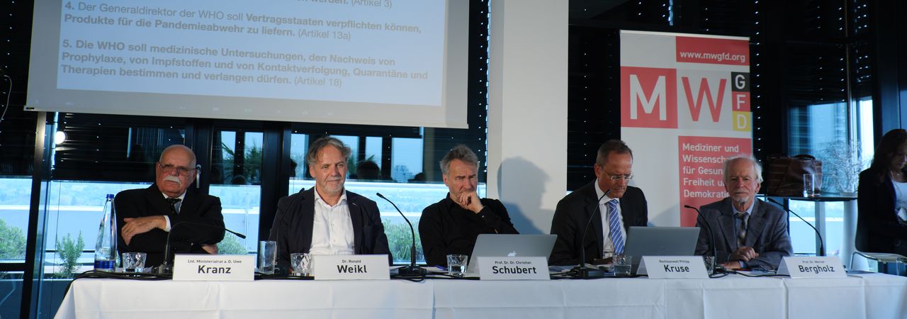 "WHO cares? Weltdiktatur droht!" Mit diesem Alarm-Stufe-Rot-Modus machte die Gesellschaft der "Mediziner und Wissenschaftler für Gesundheit, Freiheit und Demokratie e.V." (MWGFD) auf die drohende Gefahr eines weltweiten Diktats durch die WHO (Weltgesundheitsorganisation) auf ihrem in München live ausgestrahlten Pressesymposium am 8. Mai 2023 aufmerksam.