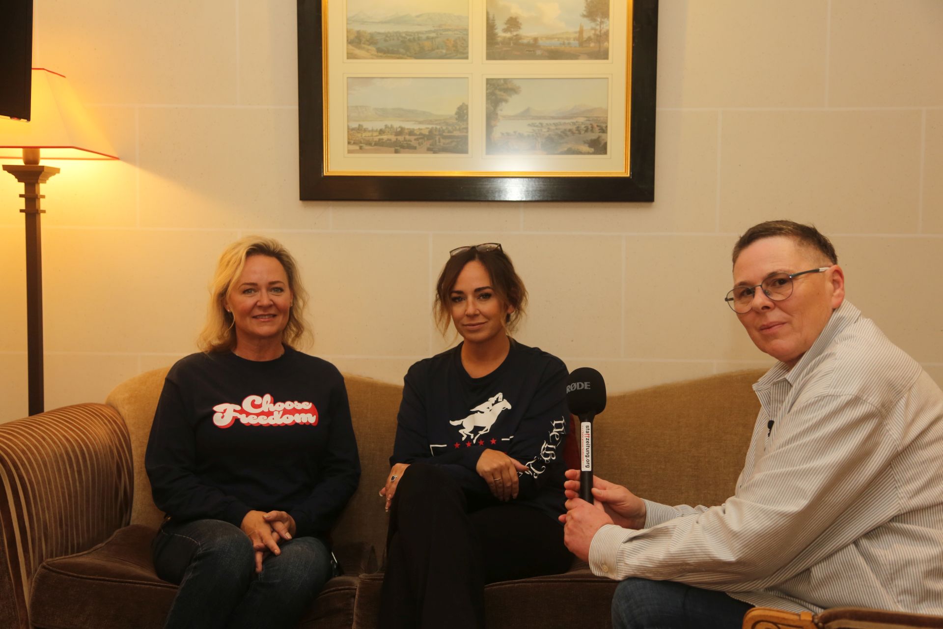 s!!z: Das ist so wichtig für uns bei stattzeitung.org, wir fragen die Menschen direkt und wir hören zu, was die Bürger zum Beispiel von den USA uns erzählen. Wir bringen nicht, was sie in irgendeinem Mainstream-Medium oder Magazin lehren wollen, was wir glauben sollen. Ihr tragt das T-Shirt "Wählt Freiheit“. Wir haben einen Krieg in Europa – Russland gegen Ukraine – und Donald Trump versprach nun schon, wenn ich wieder US-Präsident werde, werde ich diesen Krieg an einem Tag beenden. Kann das passieren oder ist das nur Propaganda?