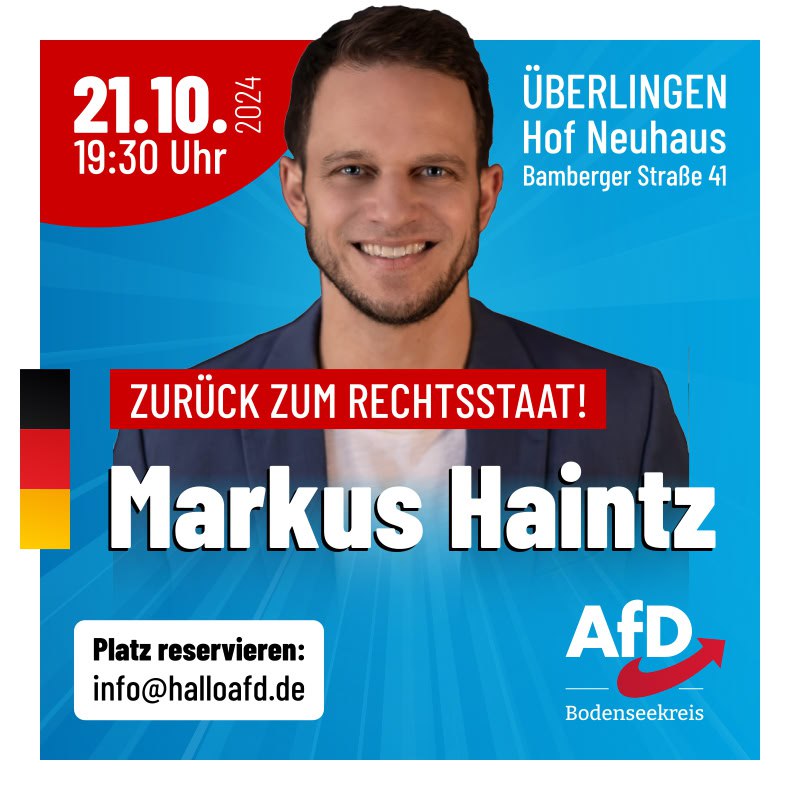 - Markus Haintz ”Zurück zum Rechtsstaat” spricht am Montag, dem 21. Oktober 2024 um 19:30 Uhr auf Einladung der AfD Bodensee im Hof Neuhaus bei Überlingen.