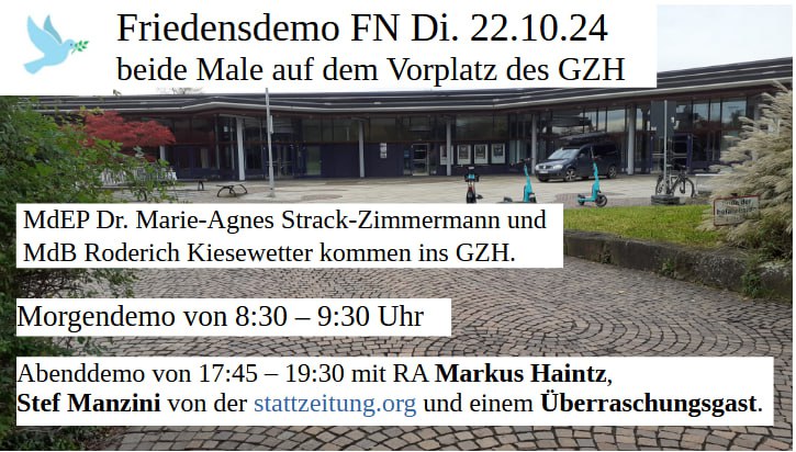 - Kundgebung für den Frieden mit Markus Haintz am Dienstag, 22. Oktober 2024 direkt zum Auftritt Strack-Zimmermanns vor dem GZH in Friedrichshafen.