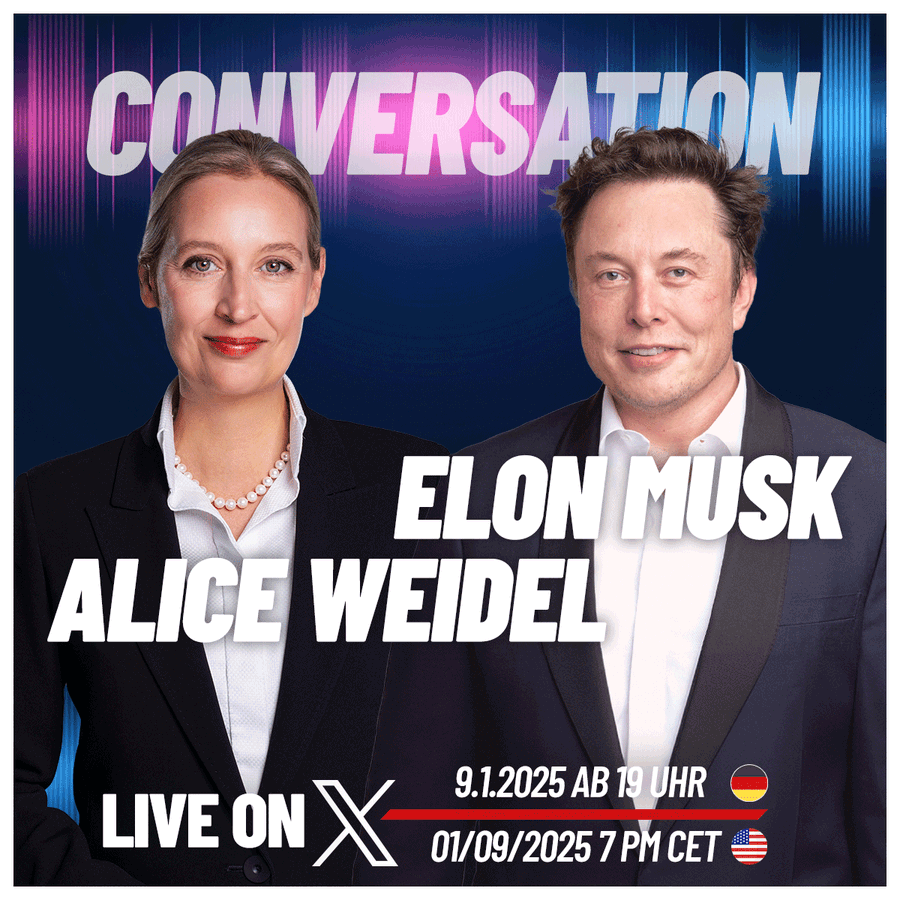 Am 9. Januar 2025 haben sich Alice Weidel und Elon Musk zu einer Diskussion auf der Plattform “X” verabredet. Wir dürfen gespannt sein.