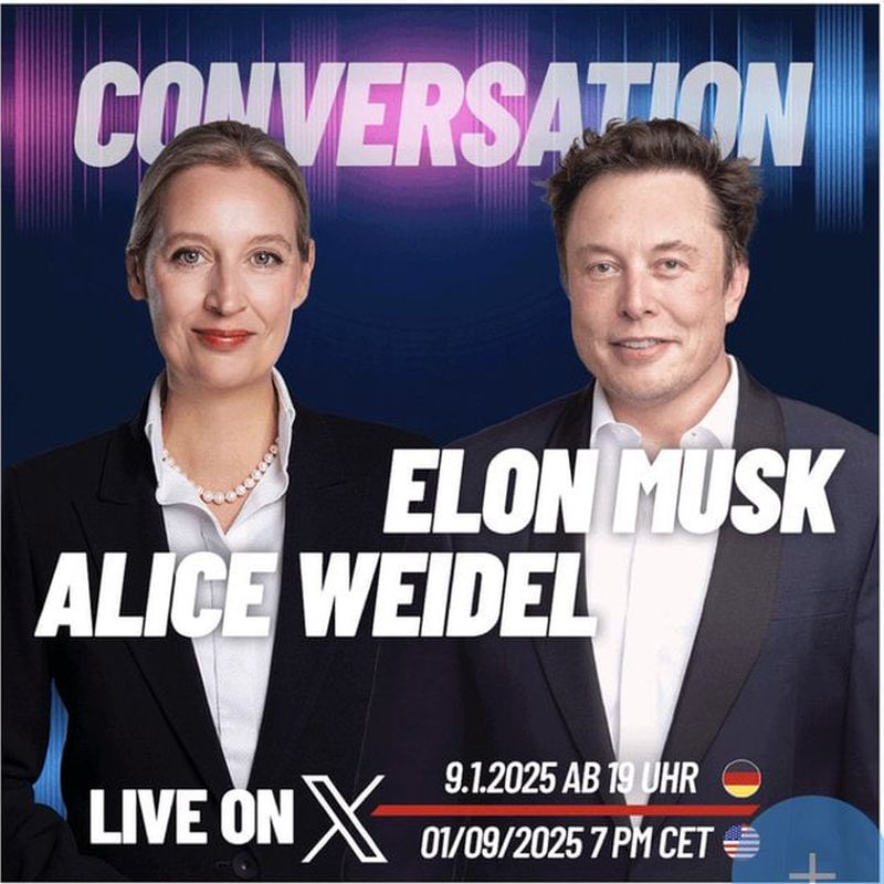 Am 9. Januar um 19 Uhr ist es so weit. Millionen sind dabei, wenn sich Alice Weidel und Elon Musk in den Sozialen Medien auf ”X” zum Gespräch ”treffen”. X steht für Meinungsfreiheit, und um die soll es auch gehen im Dialog mit dem Tech-Milliardär, sagt Dr. Alice Weidel, Co-Chefin der AfD. Der Visionär habe sie zum Gespräch eingeladen, und soviel stehe schon einmal fest- beide seien neugierig aufeinander.
