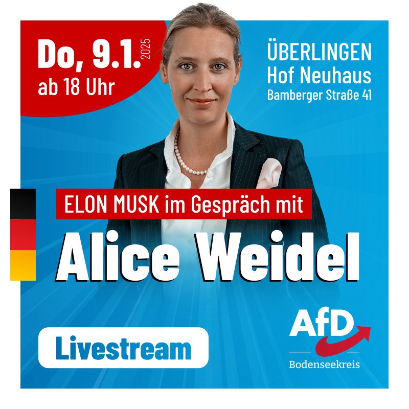 Am Donnerstag, dem 9. Januar ab 18 Uhr lädt die AfD Bodenseekreis ein, den Dialog zwischen Weidel und Musk auf einer Großleinwand live zu erleben. Beste Gesellschaft und gute Gastlichkeit wären garantiert, im Hof Neuhaus (Apfelzügle) in Überlingen. Nähere Informationen dazu in den folgenden Flyern.