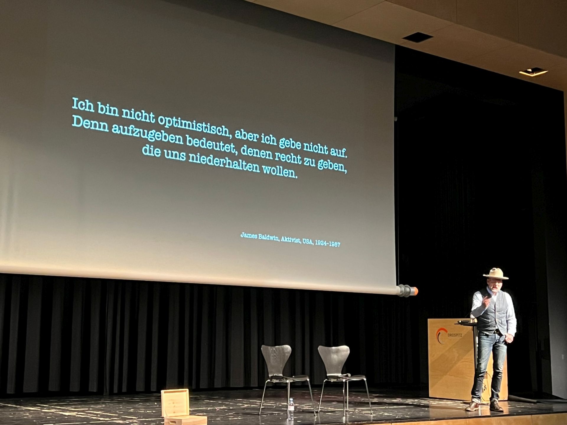 Wir leben alle mit einem ”Duck-Face”, also einer Maske, in einem Leben mit unglaublich vielen Zwängen. Selbstermächtigung heißt für Kayvan an diesem Abend im ”Dreispitz” die Menschen zu bitten, Zitate abzugeben, die eine Bedeutung für sie haben. Das muss nichts Politisches, kann eine Lebensweisheit sein. Aus diesen Zitaten wählt ein Zufallsgenerator einige aus, und der Moderator bittet dann die Verfasser auf die Bühne.