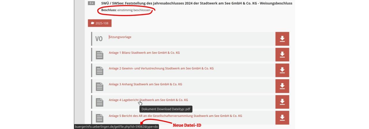 Wer den Link zum Lagebericht in meinem letzten Artikel aufruft, wird feststellen, dass er nicht mehr funktioniert. Der Lagebericht ist verschwunden. Auf der Seite zur Gemeinderatssitzung im Ratsinformationssystem hat sich gleichwohl scheinbar nichts geändert: Der Lagebericht wird nach wie vor als Anlage 4 zum Tagesordnungspunkt aufgeführt. Doch die verlinkte Datei wurde heimlich verändert: Jetzt ist eine andere Version des Lageberichts hinterlegt und diese enthält – man glaubt es kaum – die aktuelle Kapitalflussrechnung. Auch die neue Version enthält die Unterschrift des Geschäftsführers und zwar genau wie die andere mit Datum vom 31. März. Hat er am gleichen Tag einen fehlerbehafteten und einen korrekten Lagebericht unterzeichnet? Oder wurden hier nachträgliche Änderungen zurückdatiert? Jedenfalls suggeriert nun das Ratsinformationssystem der Öffentlichkeit, die neue Version des Lageberichts wäre der Beratung und dem Beschluss des Gemeinderats zugrunde gelegen. „Beschluss: einstimmig beschlossen“