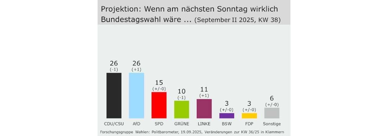 26 Prozent für die AfD in der aktuellen Umfrage des ”Politbarometers”, und damit historischer Höchststand- und Gleichstand mit der CDU/CSU. Deutschland ist weitgehend ruiniert, nicht weil die AfD das sagt. Das haben die Altparteien gemacht- und die AfD sagt das.